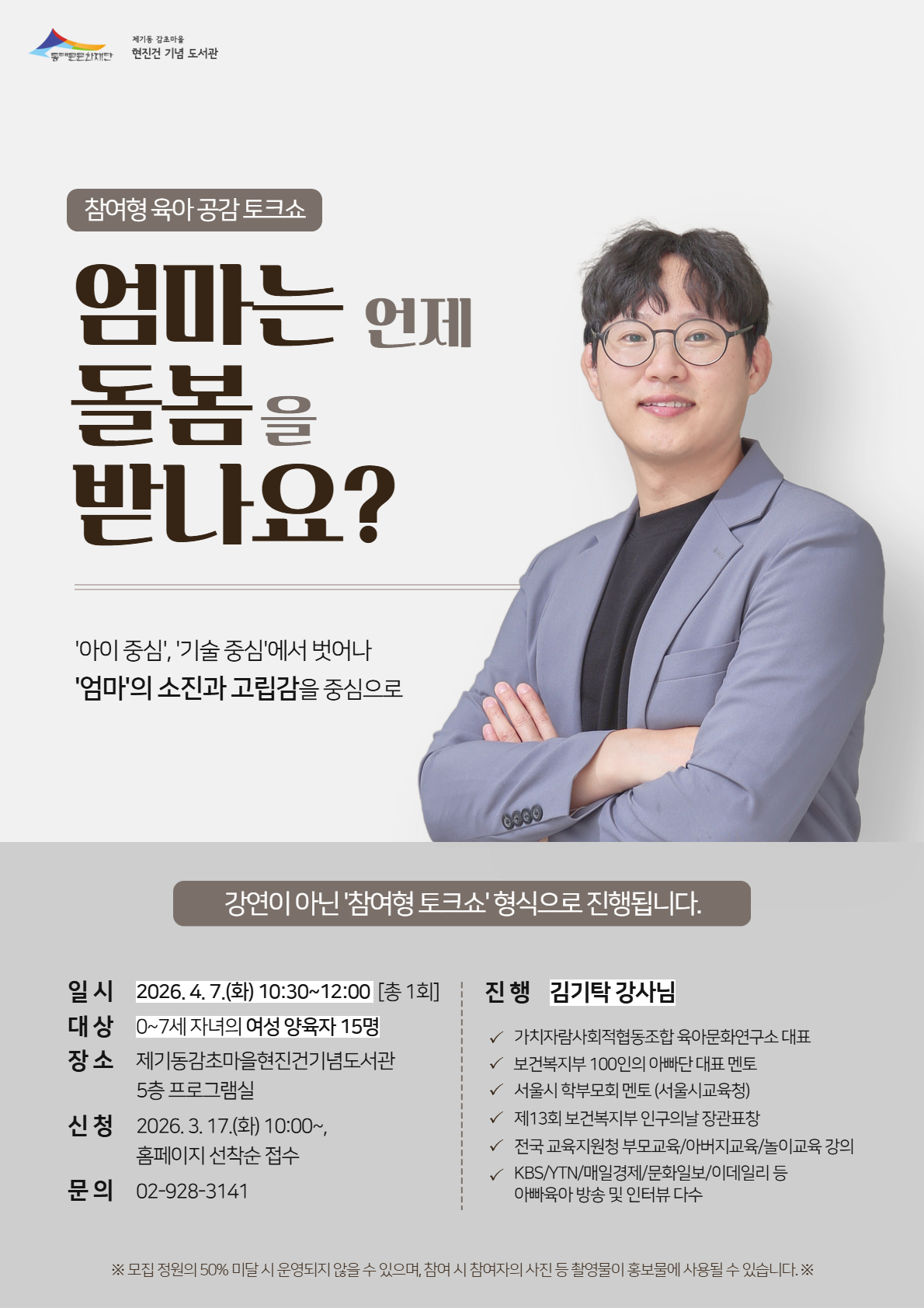 ![]() [제기동감초마을현진건기념도서관] 엄마는 언제 돌봄을 받나요? 돌봄의 중심에 있는 여성 양육자에게 직접 말을 건넵니다. '가르치는 강의'가 아니라 공감하고, 위로하고, 회복을 도와 양육자가 다시 숨을 고르고 자신을 돌아보도록 합니다. (※ 본 프로그램은 강연이 아닌 '참여형 토크쇼' 형식으로 진행됩니다.) ◆ 일시: 2026. 4. 7.(화) / 10:30~12:00 [총 1회] ◆ 장소: 제기동감초마을현진건기념도서관 5층 프로그램실 ◆ 대상: 0~7세 자녀의 여성 양육자 15명 ◆ 내용 1. 오프닝 토크 - 부모가 되는 순간, 아무도 준비시켜주지 않았던 이야기 - 전국 현장에서 만난 엄마들의 실제 목소리 2. 공감토크: 양육자의 마음을 말하다 - "힘든데 힘들다고 말할 수 없는 이유" - 혼자 감당해온 감정 구조의 이해 3. 참여형 마음 회복 활동 - 간단한 질문과 나눔을 통한 자기 감정 인식 - '나도 괜찮지 않았다'는 공감 경험 4. 관계 전환 메시지 - 부부는 역할 분담이 아니라 '팀'이라는 관점 제시 - 집에 돌아가 바로 써볼 수 있는 소통 한 문장 5. 클로징 - "엄마가 회복될 때, 아이의 일상이 달라집니다" - 양육자 자신에게 보내는 응원 메시지 (※ 본 프로그램은 강연이 아닌 '참여형 토크쇼' 형식으로 진행됩니다.) ◆ 진행: 김기탁(가치자람협동조합 육아문화연구소 대표) - 보건복지부 100인의아빠단 대표 멘토 - 서울시 학부모회 멘토(서울시교육청) - 제13회 보건복지부 인구의날 장관표창 - 전국 교육지원청 부모교육/아버지교육/놀이교육 강의 - KBS/YTN/매일경제/문화일보/이데일리 등 아빠육아 방송 및 인터뷰 다수 ◆ 신청: 2026. 3. 17.(화) 오전 10시~, 도서관 누리집 선착순 접수 ▶신청 바로가기 ◆ 문의: 02-928-3141 <프로그램 신청 전 확인 사항> • 수강자 아이디로만 접수 가능합니다. • 모집정원의 50% 미달 시 운영되지 않을 수 있습니다. • 프로그램 신청 시, 비영리적 목적에 한하여 사진 촬영 및 게시에 동의한 것으로 간주합니다. |