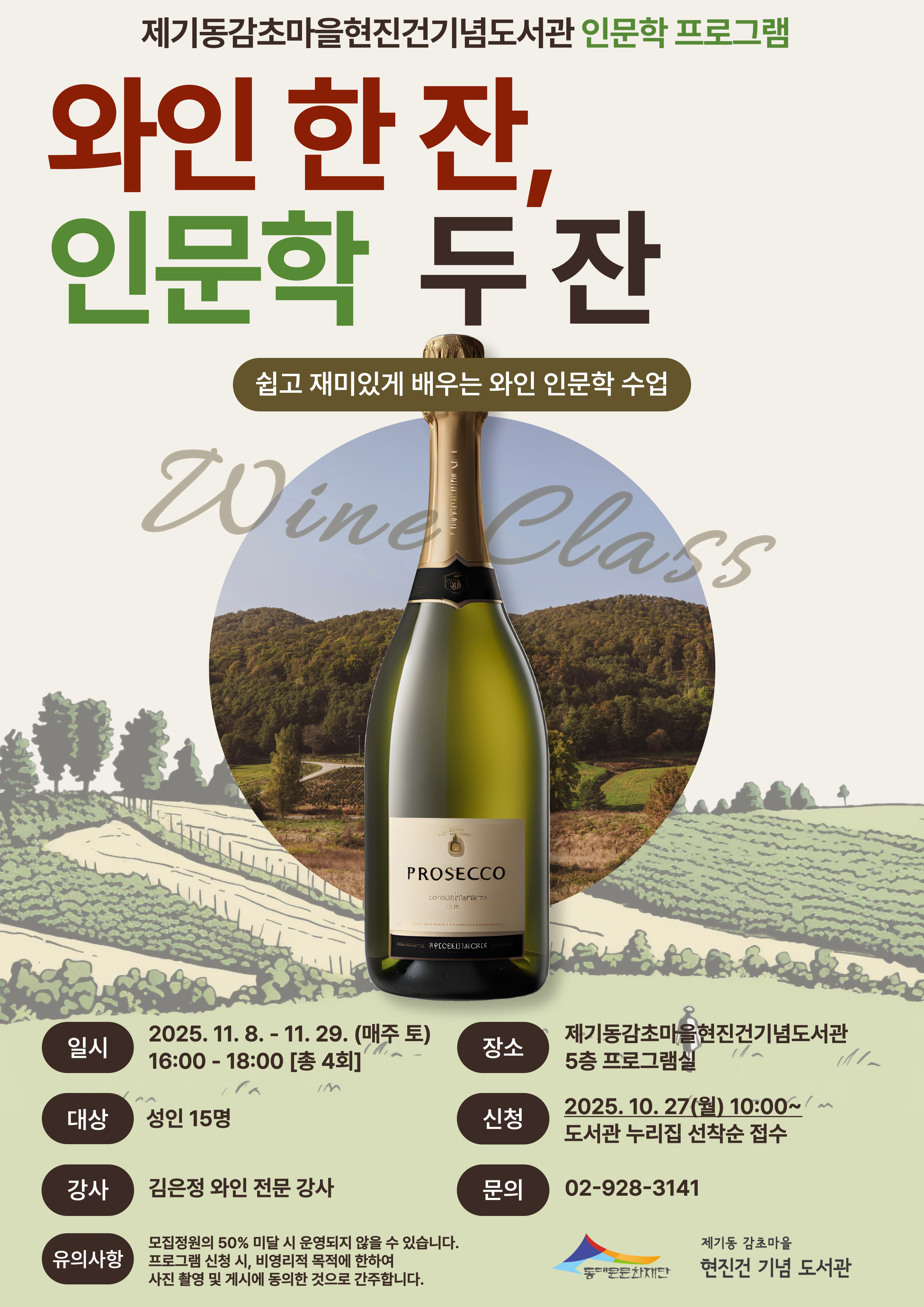 ![]() [제기동감초마을현진건기념도서관] 와인 한 잔, 인문학 두 잔 와인을 통해 인류의 문화와 라이프스타일을 새로운 시각으로 바라봅니다. ♦ 일 시: 11. 8.~11. 29. 매주 (토) 오후 16시~18시 [총 4회] ♦ 대 상: 성인 (15명) ♦ 장 소: 제기동감초마을현진건기념도서관 5층 프로그램실 ♦ 진 행 : 김은정 작가님(와인 전문 강사) - 더현대 서울, 아이파크 용산, 롯데백화점 잠실 외 백화점 출강 이력 다수 - 삼성전자, 삼성 SDI, SK TNS 외 기업 임직원 대상 워크샵 이력 다수 - 서울특별시 의사협회, 건강보험관리공단, 한국금융연수원 외 기관 임직원 대상 교육 이력 다수 ♦ 내 용 · [11/8] 인류와 함께 시작된 와인의 역사 - 와인의 기원: 인간과 와인이 처음 만난 순간 - 고대 문명에서 와인이 처음 등장한 배경과 음용 목적, 제조 방식 등을 역사 자료와 함께 살펴보고 관련 와인 테이스팅 · [11/15] 로마시대를 통해 퍼져나간 유럽의 와인 - 와인, 로마에 입성하다 - 로마시대에 와인이 유럽 전역으로 퍼진 과정과 저장·유통·소비 방식 등 로마식 와인 문화의 구조를 이해하고, 이를 반영한 와인 테이스팅 · [11/22] 신대륙 발견으로 시작된 와인의 신대륙 - 신대륙 와인의 시작과 특징 - 대항해 시대 이후 신대륙으로 전파된 포도 재배와 와인 생산의 변화 과정을 알아보고, 주요 생산국의 와인을 구대륙 와인과 비교 테이스팅 · [11/29] 직접 체험해보는 와인양조, 나만의 사과와인 만들기 - 사과와인 양조 체험 - 기초 양조 이론을 바탕으로 사과와인을 직접 담가보고, 발효 과정을 관찰하며 병입까지 실습하여 결과물을 직접 가져갑니다. ♦ 신 청: 10. 27.(월) 오전 10시부터 도서관 누리집 선착순 접수 ♦ 문 의: 02-928-3141 <프로그램 신청 전 확인 사항> • 수강자 아이디로만 접수 가능합니다. • 모집정원의 50% 미달 시 운영되지 않을 수 있습니다. • 프로그램 신청 시, 비영리적 목적에 한하여 사진 촬영 및 게시에 동의한 것으로 간주합니다. |