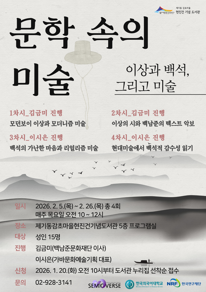 ![]() 제기동감초마을현진건기념도서관 문학 속의 미술: 이상과 백석, 그리고 미술 1차시_ 김금미 진행 모던보이 이상과 모더니즘 미술 2차시_김금미 진행 이상의 시와 백남준의 텍스트 악보 3차시_이시은 진행 백석의 가난한 마음과 리얼리즘 미술 4차시_이시은 진행 현대미술에서 백석적 감수성 읽기 일시 2026. 2. 5.(목)~2. 26.(목) 총 4회 매주 목요일 오전 10~12시 장소 제기동감초마을현진건기념도서관 5층 프로그램실 대상 성인 15명 진행 김금미(백남준문화재단 이사) 이시은(가바문화예술기획 대표) 신청 2026. 1. 20.(화) 오전 10시부터 도서관 누리집 선착순 접수 문의 02-928-3141 <프로그램 신청 전 확인 사항> • 수강자 아이디로만 접수 가능합니다. • 모집정원의 50% 미달 시 운영되지 않을 수 있습니다. • 프로그램 신청 시, 비영리적 목적에 한하여 사진 촬영 및 게시에 동의한 것으로 간주합니다. |