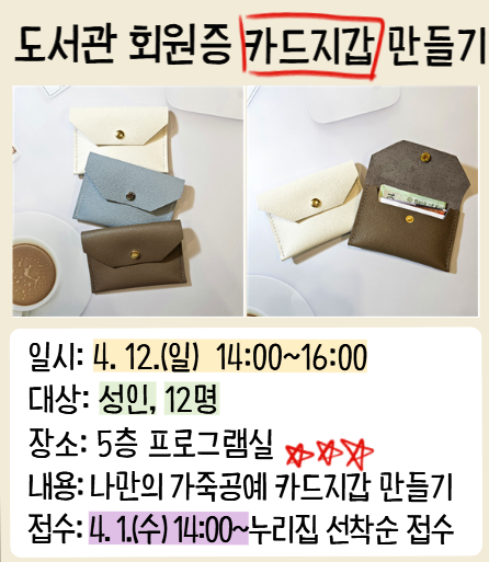 ![]() [제기동 감초마을 현진건 기념 도서관] 🎁2026년 도서관의 날·도서관주간 행사🎁 🔸도서관 회원증 카드지갑 만들기🔸 - 날짜: 4. 12.(일) 14시~16시 - 대상: 성인 12명 - 장소: 5층 프로그램실 - 접수: 4. 1.(수) 14시~, 누리집 접수 • 유의사항: 수강자(본인) 아이디로만 접수 가능 • 문의: 02-928-3141 <프로그램 신청 전 확인 사항> * 모집정원의 50% 미달 시 운영되지 않을 수 있습니다. * 프로그램 해당 연령에 맞게 신청해 주세요. 해당 연령이 아닐 경우 신청이 취소될 수 있습니다. * 프로그램은 운영 사정에 따라 변동될 수 있습니다. * 프로그램 신청 시, 비영리적 목적에 한하여 사진 촬영 및 게시에 동의한 것으로 간주합니다. |