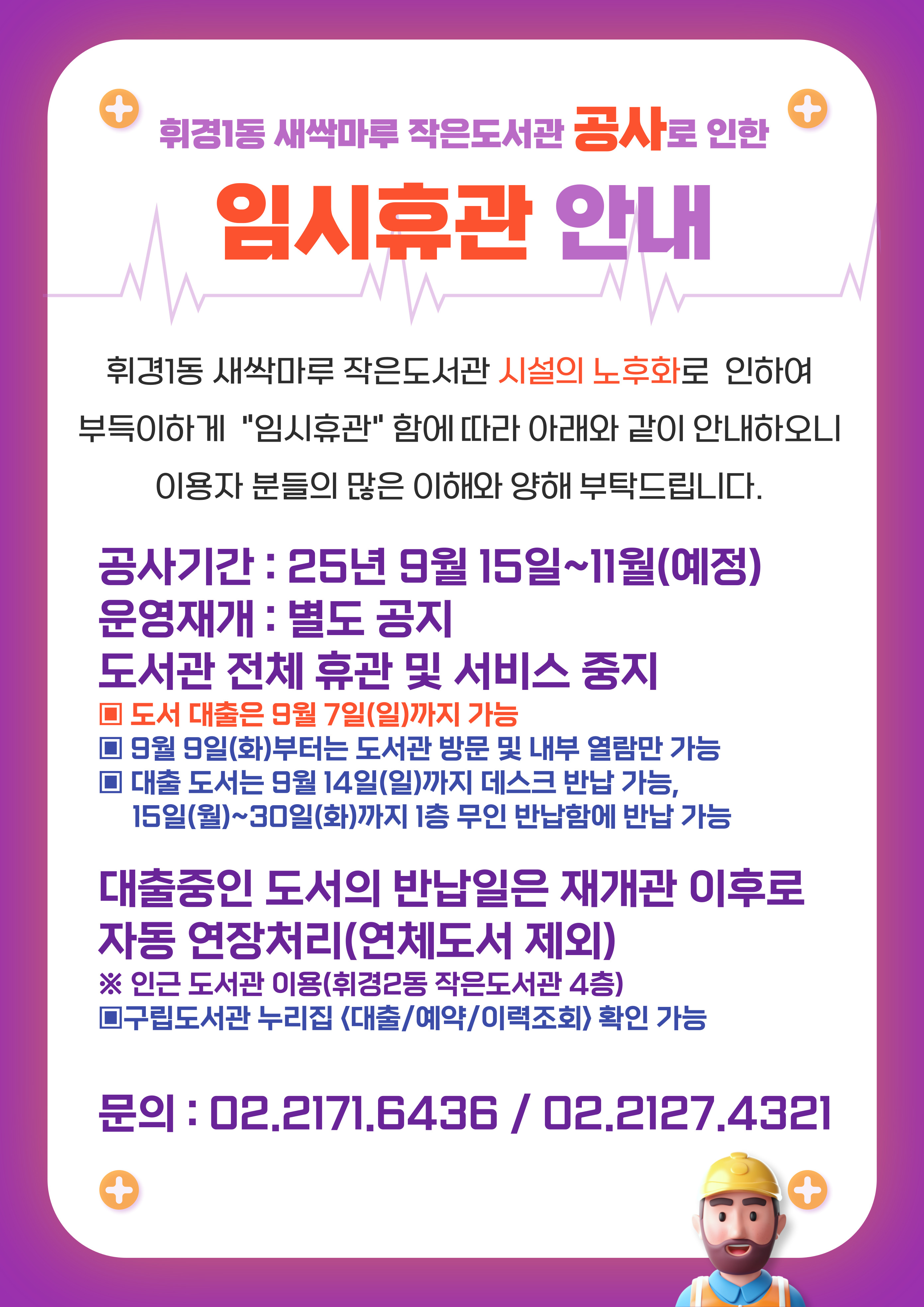 휘경 1동 새싹마루 작은 도서관 휴관안내 (9월 15일 - 별도안내)