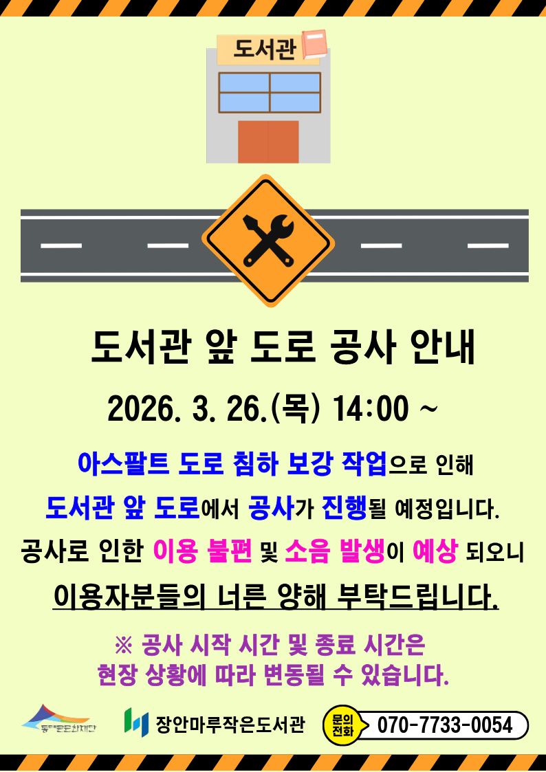 2026. 3. 26.(목) 14:00부터 아스팔트 도로 침하 보강 작업으로 인해 도서관 앞 도로에서 공사가 진행될 예정입니다.
