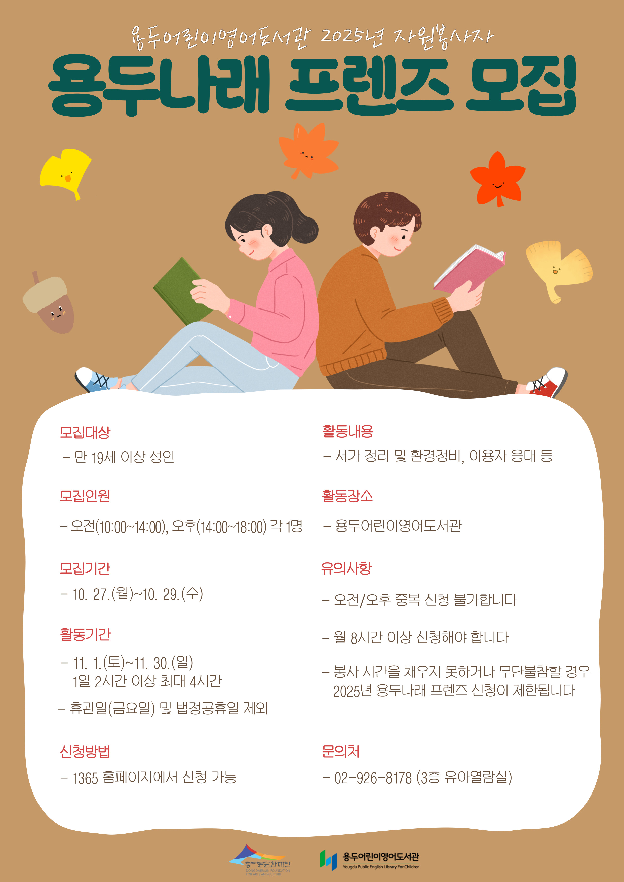 |  [용두어린이영어도서관] 11월 용두나래 프렌즈 모집 도서관에 관심이 많으며 봉사심을 가지고 도와주실 분들의 많은 지원 바랍니다 문 의: 02-926-8178 봉사일시: 2025. 11. 1.(토)~11. 30.(일) 대 상: 만19세 이상 성인 인 원: 오전(10:00~14:00), 오후(14:00~18:00) 각 1명 활동내용: 서가 정리 및 환경 정비, 이용자 응대 등 신청방법: 1365 홈페이지에서 신청 가능 신청기간: 2025. 10. 27.(월)~10. 29.(수) 신청 유의사항: - 오전/오후 중복 신청 불가합니다 | |
