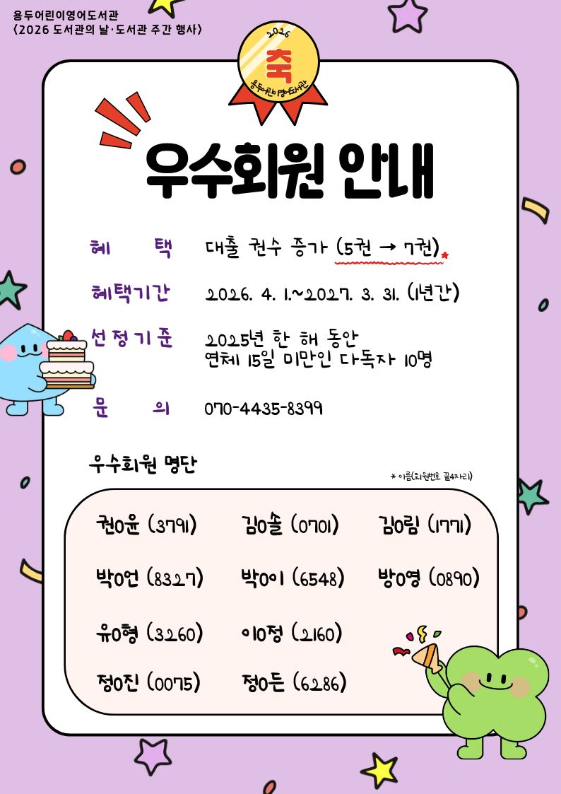 | 제목 | [용두어린이영어도서관] 2026년 도서관의 날·도서관주간 행사 기념 우수 회원 선정 안내 |