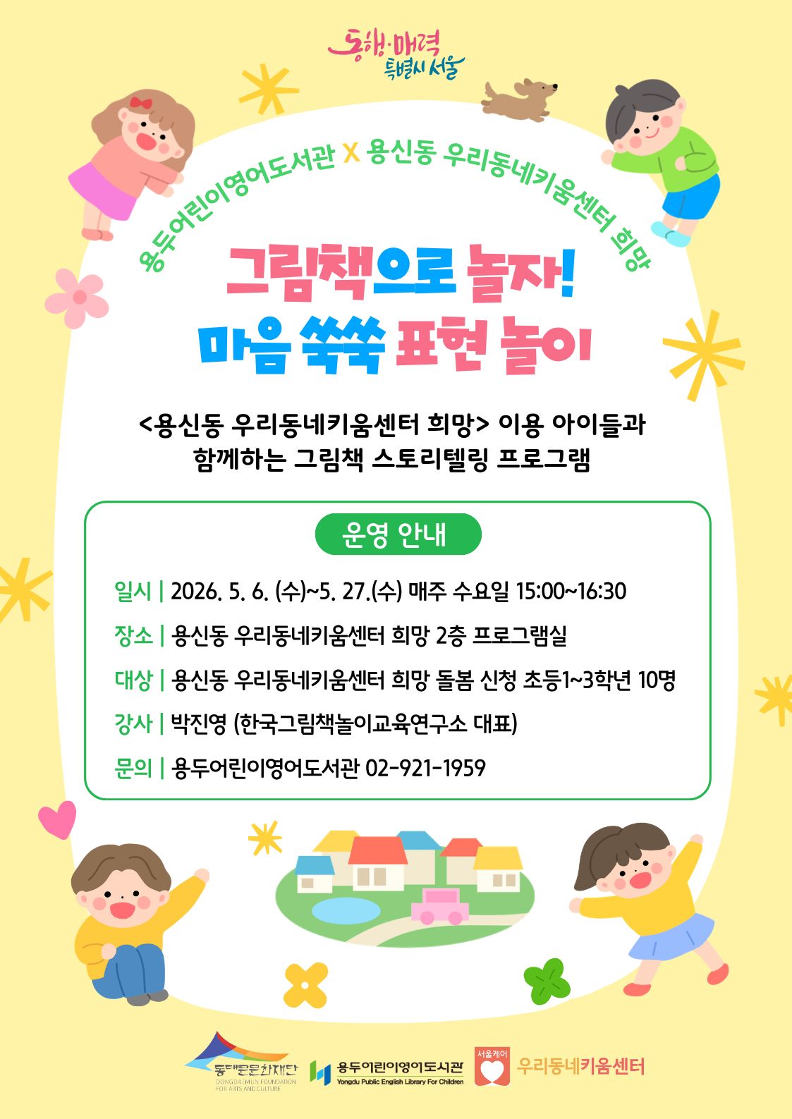 ★용두어린이영어도서관 X 용신동 우리동네키움센터 희망★ 5월 협력 프로그램 진행 도서관과 지역 돌봄 기관인 우리동네키움센터와 협력하여 그림책 독서문화 프로그램을 진행합니다. 대상은 용신동 우리동네키움센터 희망 이용 초등학생 대상이며 모집은 용신동 우리동네키움센터 희망에서 진행됩니다! - 일시: 2026. 5. 6.(수) ~ 5. 27.(수) 매주 수요일 오후 3시 ~ 4시30분, 총 4회 - 장소: 용신동 우리동네키움센터 희망 2층 프로그램실 - 대상: 초등 1 ~ 3학년 10명 - 문의: 용두어린이영어도서관 02-921-1959 ![]() |