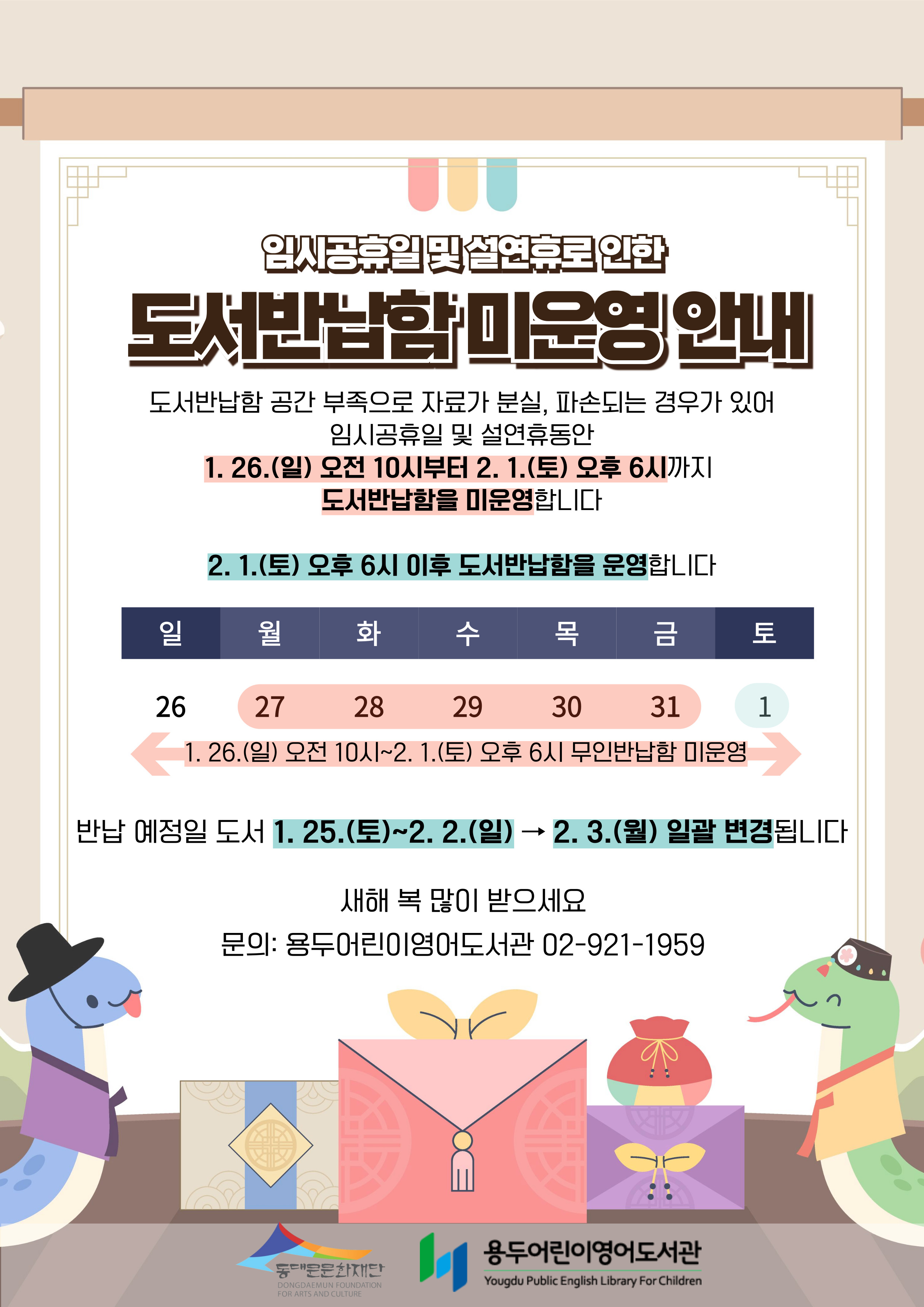 ![]() [용두어린이영어도서관] 임시공휴일 및 설연휴로 인한 도서반납함 미운영 안내 도서반납함 공간 부족으로 자료가 분실, 파손되는 경우가 있어 임시공휴일 및 설연휴동안 1. 26.(일) 오전 10시부터 2. 1.(토) 오후 6시까지 도서반납함을 미운영합니다 2. 1.(토) 오후 6시 이후 도서반납함을 운영합니다