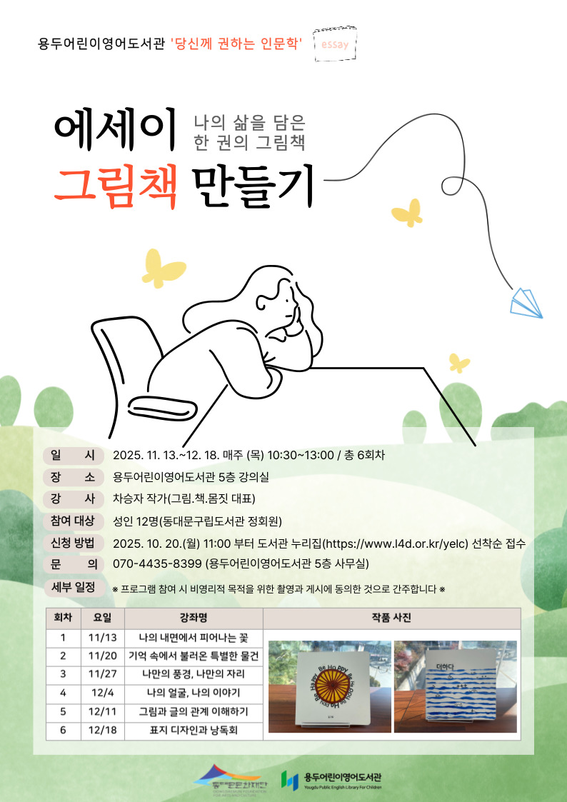 ![]() 나의 삶을 담은 한 권의 그림책, <에세이 그림책 만들기> ■ 일시: 2025. 11. 13.~12. 18.(매주 목요일) 10:30~13:00 ■ 장소: 용두어린이영어도서관 5층 강의실 ■ 강사: 차승자 작가(그림.책.몸짓 대표) ■ 참여 대상: 성인 12명(동대문구립도서관 정회원) ■ 신청 방법: 2025. 10. 20.(월) 11:00부터 도서관 누리집에서 선착순 접수 ■ 문의: 070-4435-8399 (용두어린이영어도서관 5층 사무실) 나의 삶을 기록하고, 나만의 그림책으로 완성해보세요! |