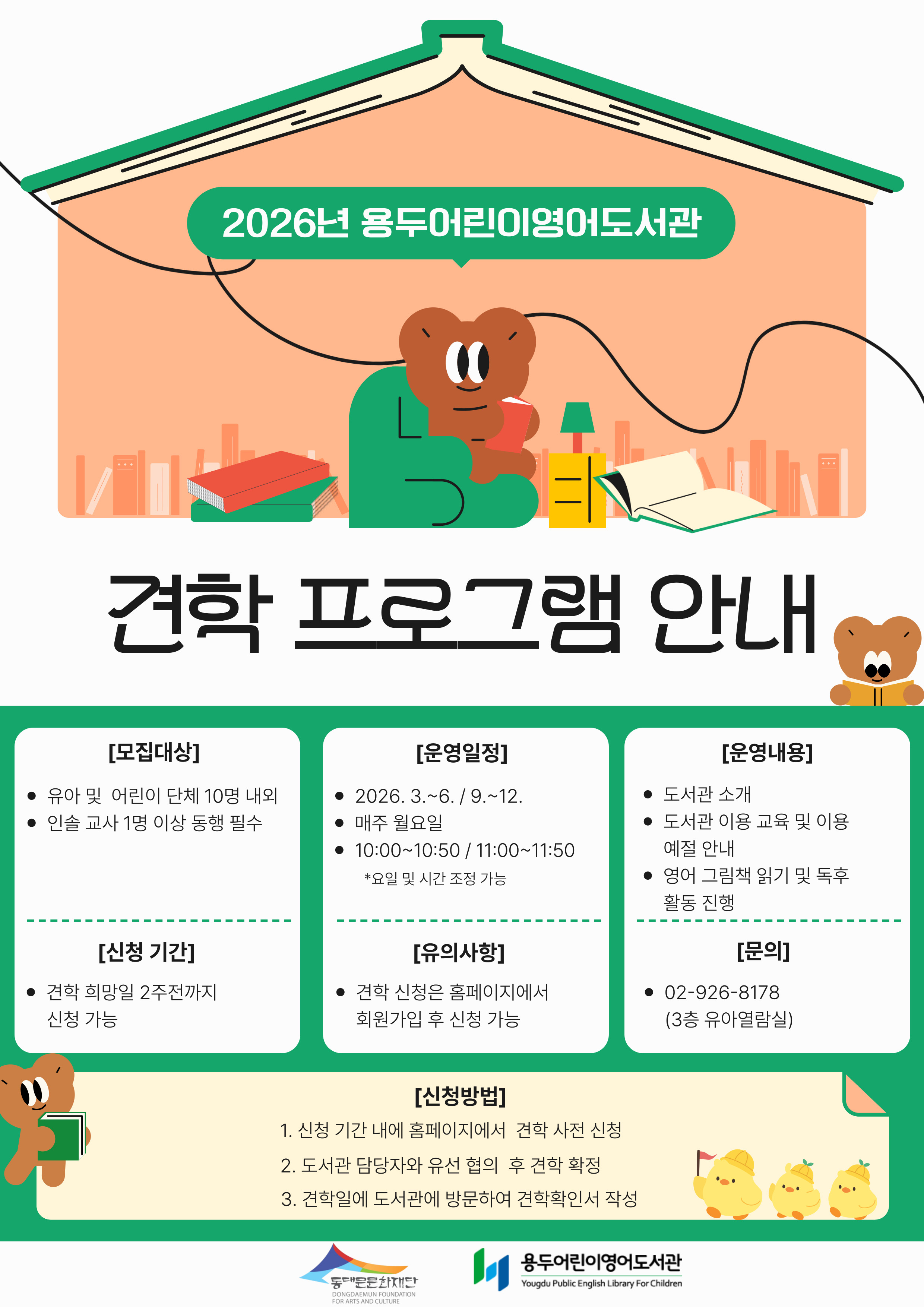 *첫 방문인 기관의 인솔 선생님께서는 견학 신청 전 아래 번호로 문의 바랍니다. 문의: 용두어린이영어도서관 02-926-8178 |