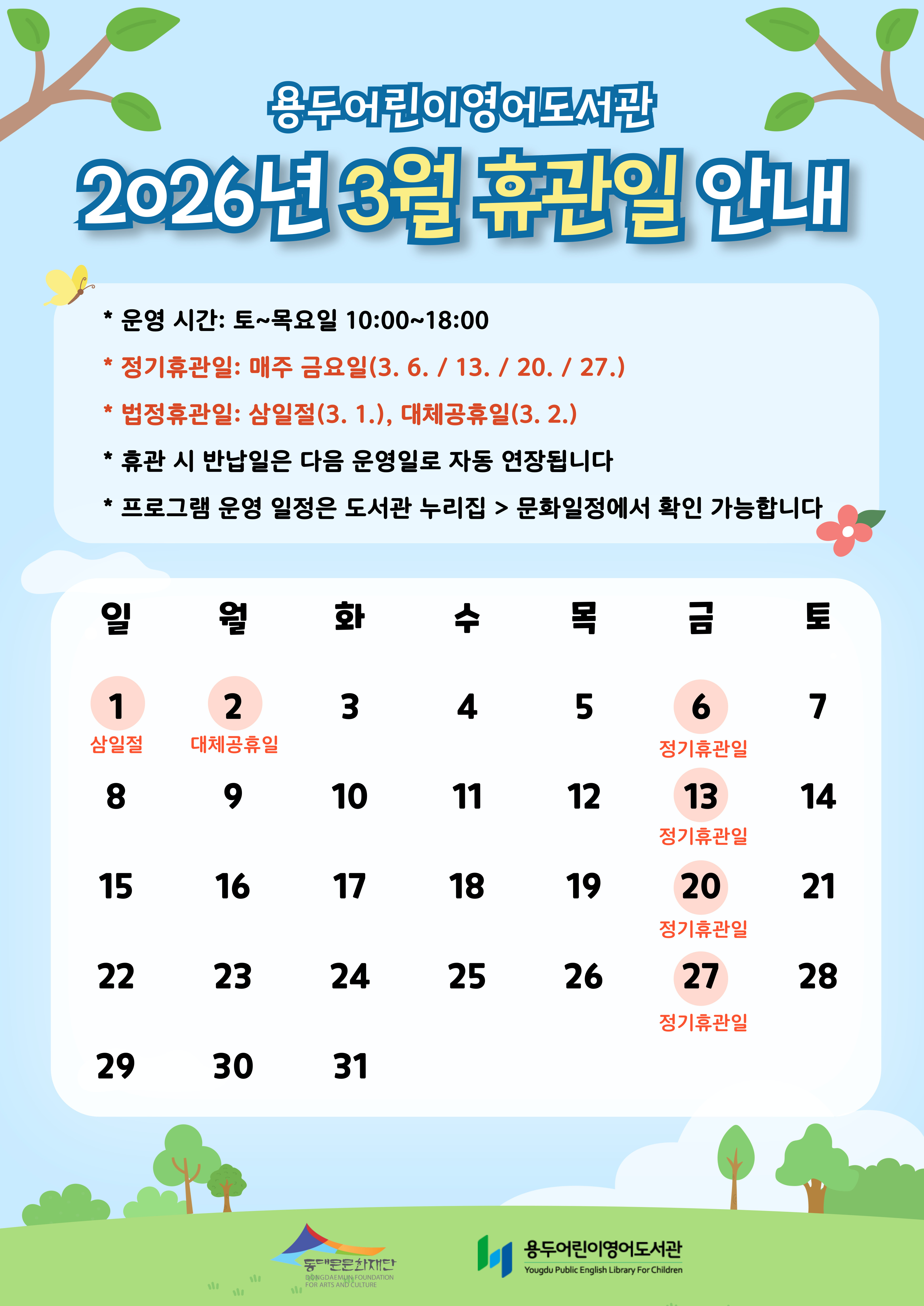 [용두어린이영어도서관] 2026년 3월 휴관일 안내